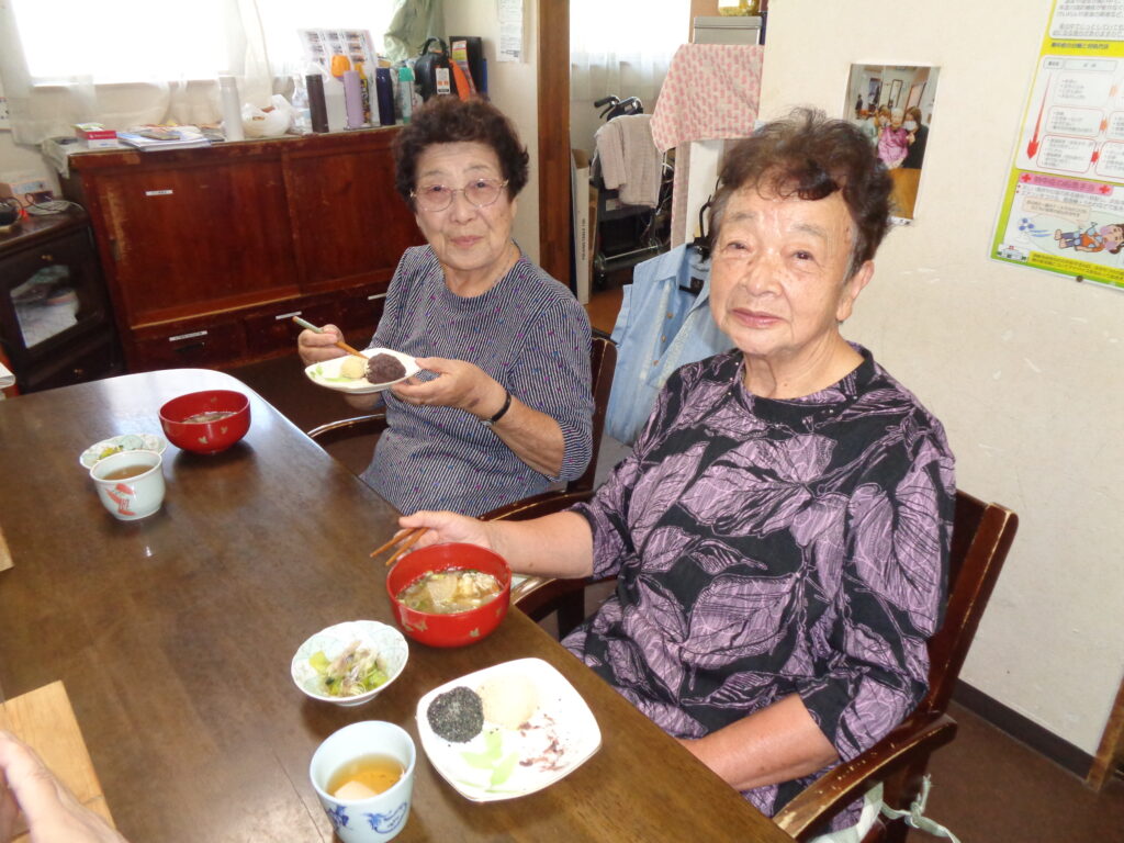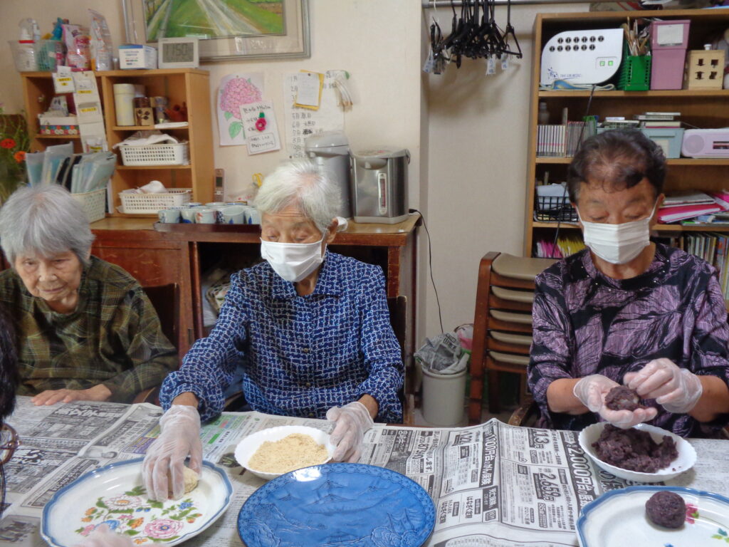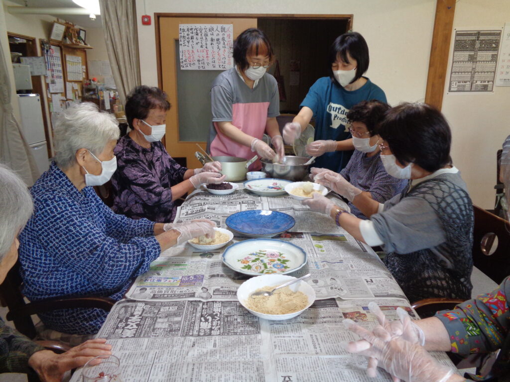 あんこ、きな粉、胡麻をつけるのは女性利用者さんが担当して下さいました。あんこをつけるのは難しいかな…と思いましたが、やはり年の功‼上手にきれいにつけて下さいました。