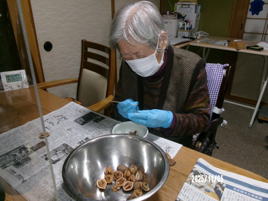 五平餅作りの様子です。まずは、クルミの実を取る作業からスタート。竹串を使って、丁寧に取ってくださいました。味噌が出来た後、数日寝かせて、、、いよいよ五平餅作り😊皆さん、さすがの手際の良さでした!