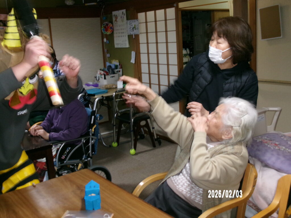 節分 2026 3/05 サテライト三日市場 2026年3月3日2026年3月5日 節分の豆まきをしました 職員が扮する鬼が三日市場にやって来ました😊皆さん夢中で豆をぶつけてくれていました。鬼は逃げていったので、皆さんの元に福が訪れるはずです😊 サテライト三日市場