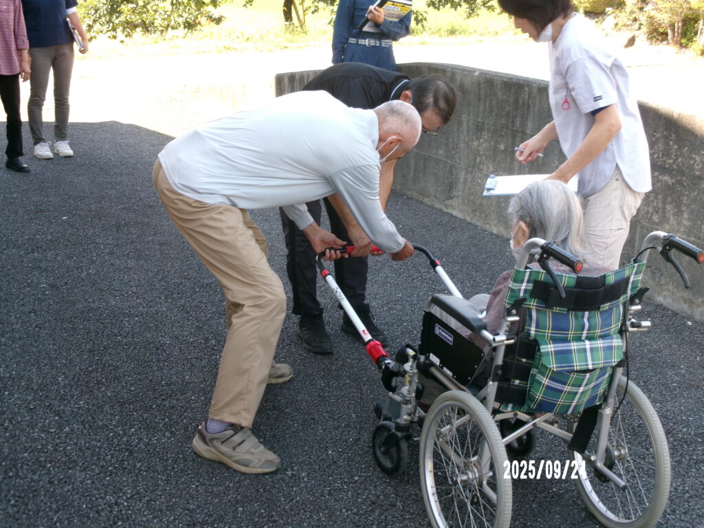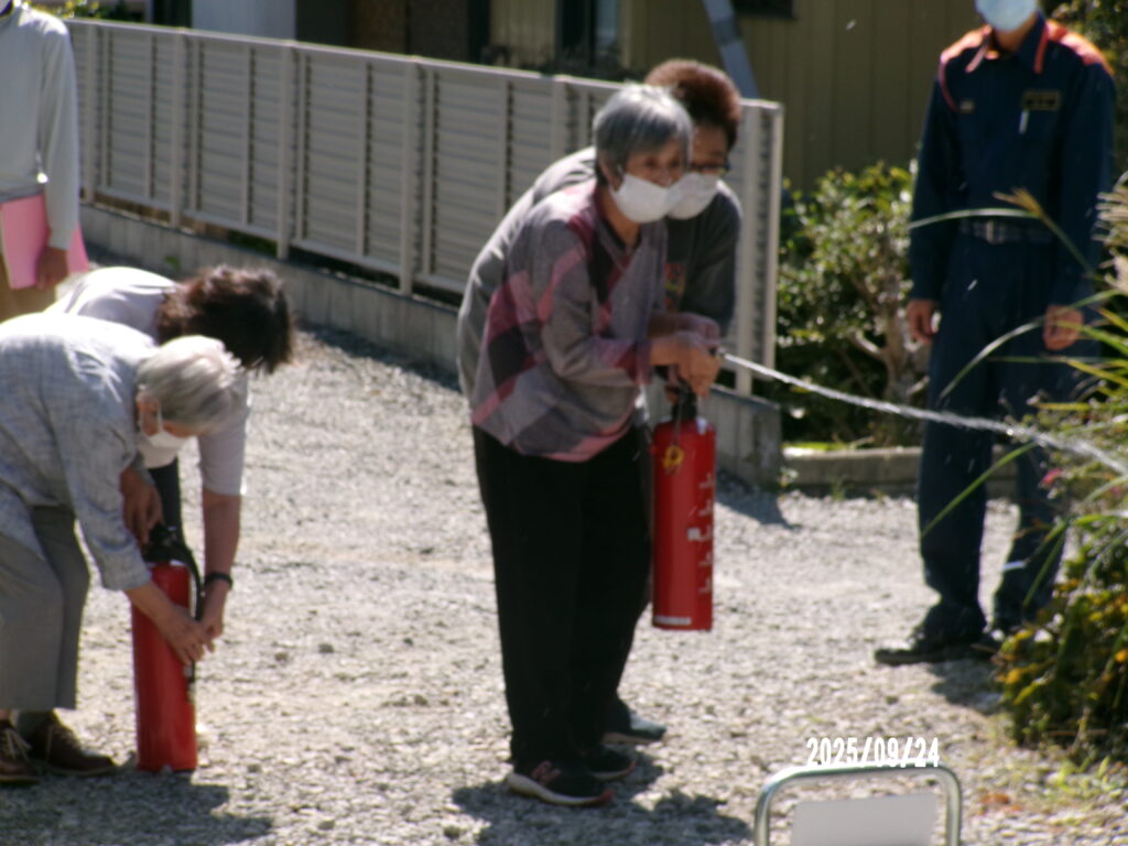 消防署の職員の方に来ていただき、避難訓練を行いました。事業所の台所から出火した想定で、近所の駐車場まで避難しました。災害時に車椅子に装着して使用する、「JINRIKI」の使用訓練も、運営推進委員の皆さんと行いました。模擬消火器による消火訓練も行い、利用者様も練習してくださいました。訓練後は、室内で、消防署の方のお話を聞きました。皆さん、興味深く聞いておられました。